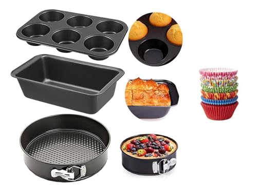 Package Contents: 4 in1 Cake Making Set – Round Shape Cake Mould, Bread Loaf Pan, 6 Slot Muffin Tray, & 100 Pcs Paper Cake Cup Liners I Material: Carbon Steel & Paper I Color: Black & Multicolor I Bake ware Combo for Professionals and Home Bakers I Enjoy cake baking and decorating very easy and convenience I Easy to Clean.