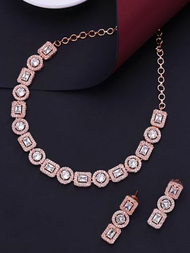 HIGH-QUALITY MATERIAL: Crafted with A5 Grade American Diamond Crystals and rose gold plating on brass, this Yellow Chimes Jewellery Set exudes elegance and durability. Featuring stunning clarity and sparkle, this set comes with drop earrings and a lobster clasp hook for a secure fit.