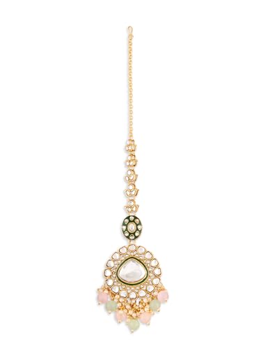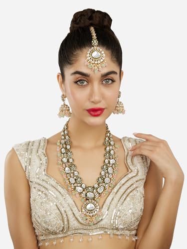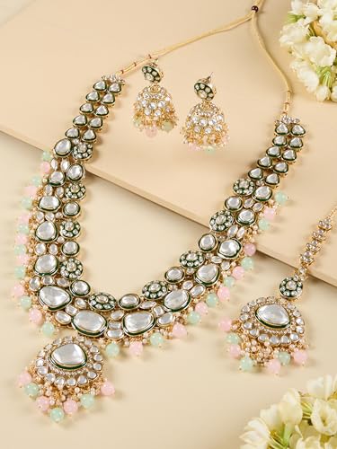 ZAVERI PEARLS Pink Green Beads Dazzling Stones Meenakari Bridal Long Necklace Earring & Maangtikka Set For Women-ZPFK18099